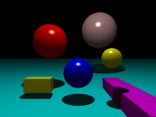 The red sphere is defined as follows. It has center < -2.5, 2.5, 2.5 > and radius 1.5. Its phong value is 1, the maximum. In fact, all shapes in this scene have phong value 1.