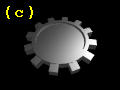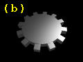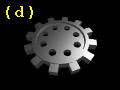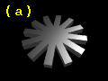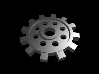 The body of the gear is simply a cylinder with thickness a little larger than that of the boxes. The boxes have thickness 1 and therefore the body has thickness 1.1. A union is required to put the above six boxes and this body cylinder together as shown below. The result is in above figure (b). In the following, Thickness and OuterRadius are 1 and 4, respectively.