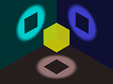 On the cover of his 1980 Pulitzer Prize book Gödel, Escher, Bach: an Eternal Golden Braid, Douglas R. Hofstadter designed a trip-let suspending in space near a corner so that their shadows in three orthogonal directions are three different letters, G for Gödel, E for Escher and B - for Bach. Let us simplify Hofstadter's work a little. You are given a scene file in POV-Ray as shown below left. It consists of a yellow cube, three perpendicular wall meeting at the corner, and three spotlights generating three square shadows, one on each wall. You job is generating the scene shown in the right figure using Boolean operators. You only need to modify Initial_Block to become a new block and keep all other components unchanged.