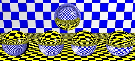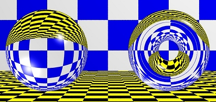 The follow image contains a sphere (IOR 1.33, water) and a torus (IOR 1.51, crown glass). They are 100% transparent (i.e., filter being 1). Due to refraction (i.e., light bending), the ground texture (i.e., checker) can be seen on the top part of both objects.