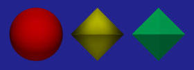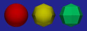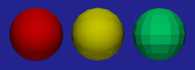 The above figures show the effects of different numbers of subdivisions. Each figure contains three spheres. The left one is given by sphere { < 0, 0, 0 >, 1 }, the middle one uses smooth_triangle {} and the right one uses triangle {}. The first figure shows two subdivisions in each direction. More precisely, [0,2*PI] is subdivided into [0,PI] and [PI,2*PI]. Therefore, the domain [0,2*PI] x [0, 2*PI] is subdivided into four smaller squares each of which is further subdivided into two triangles. Therefore, there are eight triangles in total. As you can see from the figure, both smooth_triangle {} and triangle {} do not look like spheres.