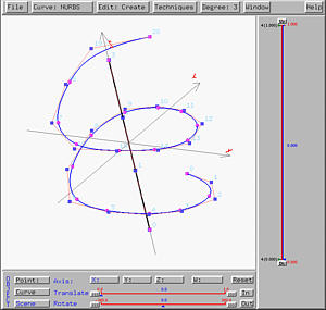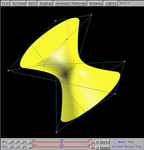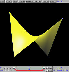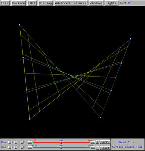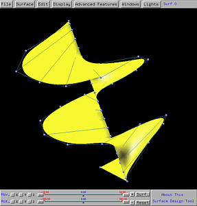 To design a ruled surface, select Advanced Features followed by Cross Sectional Design. This will bring up the curve system. In the curve system, just design two NURBS curves that are not coplanar, and then select Techniques followed by Generate Ruled Surface. The surface system will display a ruled surface defined by the two curve in the curve system.