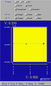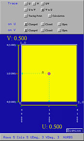 There is a circular dot, the uv-indicator, with two dashed line segments giving its u value and v value. This is a point (u,v) that can be dragged in the unit square. As this indicator moves, the corresponding u and v values, which are shown in yellow, also change. To see the corresponding point on the surface, click on the Tracing Point button on the top part of this window. Then, the corresponding points on the surface is shown as a red sphere. The following shows the tracing point on the surface corresponding to (0.9, 0.53):