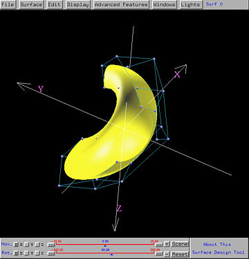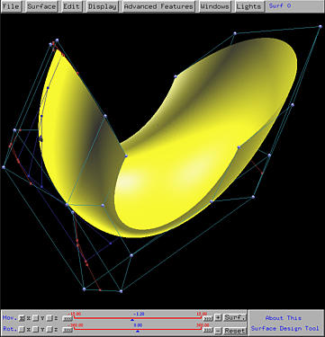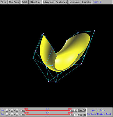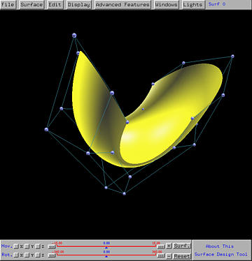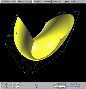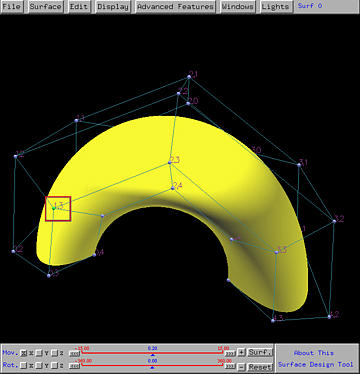 Dragging the little disk in the top window will cause the selected control point moving in the xy direction. More precisely, as the little disk moves, the x- and y-coordinate values of the selected control point will change and the z-coordinate is kept the same. Similarly, the second and the third windows are for moving a selected control point in the xz and yz directions, respectively. The x-, y- and z-coordinate and the weight w (if the surface is a NURBS surface) are displayed in the bottom of this window.