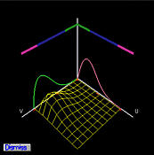 The above left figure shows a B-spline surface with control point 1,3 (i.e., row 1 and column 3) selected. Thus, the Partition of Unity window shows N1,p(u) in the u direction and N3,q(v) in the v direction. Note that p and q are the degrees in the u and v directions. The product, N1,p(u)N3,q(v), is the coefficient (i.e., two-dimensional basis function) for control point 1,3.