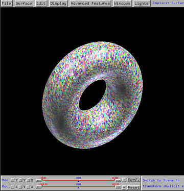 The polygonizer subdivides the surface of the torus into 31068 triangles with 15534 vertices. Each triangle is displayed with a random color as shown in the above figure.