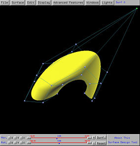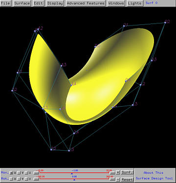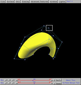 The following left figure shows a selected control point. After moving in the xy direction to a new position, the shape of the surface is changed (the right figure). In fact, part of the surface is pulled in the moving direction of the selected control point.