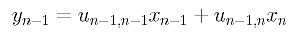 Now, xn is immediately available from equation n, because xn = yn/un,n. Once xn is available, plugging it into equation n-1