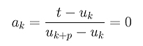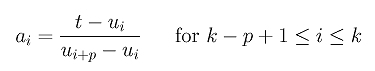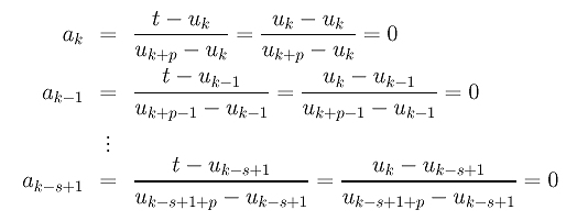 What if the new knot t is inserted at a multiple knot? Suppose t is inserted at knot uk of multiplicity s. Hence, we have s consecutive equal knots: uk = uk-1 = uk-2 = .... = uk-s+1 and uk-s+1 being not equal to uk-s. In the computation of coefficients ak, ...., ak-p+1, we have the following: