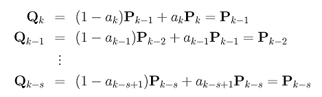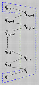 The above computation scheme can be illustrated with the following diagram. First, the affected control points are listed on the left column. Then, the computed new control points are listed on the second column. Note that the number of new control points is one less than the affected control points. The computation of new control point Qi, where k-p+1 <= i <= k, requires two original control points Pi-1 and Pi with coefficients 1-ai and ai, respectively. After the computation, use the points surrounded by the blue dotted line to replace those not in the region. All unaffected control points are preserved. Therefore, the original set of control points Pk-p, Pk-p+1, ..., Pk-1, Pk is replaced with Pk-p, Qk-p+1, ..., Qk-1, Pk.