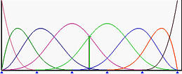 The figure shown at the beginning of this example shows the new control points and the new control polyline in orange, Note that the new control points are P0, P1, P2, P3, P4, Q5, Q6, Q7, Q8 = P7, P8, P9, P10 and P11. The curve and its basis functions after the new knot t = 0.5 is inserted is shown below.