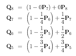 The following diagram shows the relationship between the old and new control points. Note that the new set of control points contains P0, P1, P2, Q3, Q4, Q5, P5, P6 and P7.