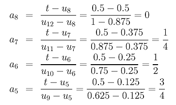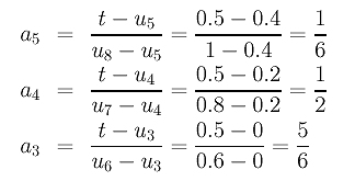 We want to insert a new knot t = 0.5. Since t = 0.5 lies in knot span [u5,u6), the affected control points are P5, P4, P3 and P2. To determine the three new control points Q5, Q4 and Q3, we need to compute a5, a4 and a3 as follows: