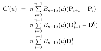 Since the control points are constants and independent of the variable u, computing the derivative curve C'(u) reduces to the computation of the derivatives of Bn,i(u)'s. With some simple algebraic manipulations, we have the following result for B'n,i(u):