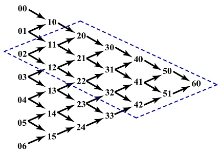 Let us investigate the contribution of 02. Since each point ij is multiplied by 1-u (resp., u) to compute its south-east (resp., north-east) neighbor, 02 is used by the computation of 11 and 12. Since 11 (resp., 12) has a component of 02, when 11 (resp., 12) is used to compute 20 and 21 (resp., 21 and 22), the contribution of 02 propagates to 20, 21 and 22. Therefore, the contribution of 02 can only reach the intermediate points in the diamond shape area as shown above.