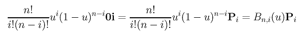 With this idea in mind, proving the correctness of de Casteljau's algorithm is very simple. Control point 0i contributes to the computation of n0 through all possible paths from 0i to n0. How many paths are there? Think this problem in the following way. Each path always has n arrows. Of these n arrows, i arrows are north-east bound. Hence, the number of ways of inserting these i arrows into n positions is equal to the number of different paths from 0i to n0. This is exactly the combinatorial coefficient C(n,i)=(n!)/(i!(n-i)!). Since the contribution of each path is always ui(1-u)n-i and since we have (n!)/(i!(n-i)!) paths, the total contribution of 0i to n0 is the following: