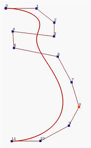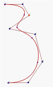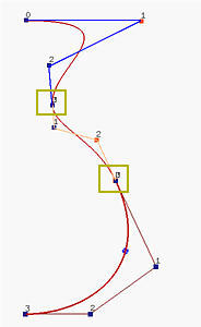 Is it possible that we still can use lower degree curve segments without worrying about the "collinearity" condition? B-spline curves are generalizations of Bézier curves and are developed to answer this question. The right figure above is a degree three B-spline curve with 8 control points. In fact, there are five degree 3 Bézier curve segments joining together to form the B-spline curve defined by the control points. In the above, the little dots subdivide the curve into segments. One can move control points for modifying the shape of the curve just like what we do to Bézier curves. We can also modify the subdivision of the curve. Therefore, B-spline curves have higher degree of freedom for curve design.
