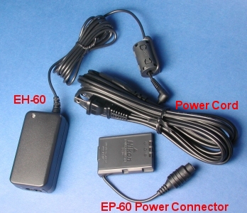 The Nikon EH-60 kit consists of three pieces: the EP-60 Power Connector, the EH-60 AC Adapter and a power cord. See the image below. The purpose of the EH-60 kit is to allow Coolpix 2500 to use AC power rather than relying on battery power. It is especially useful if you will use your camera for a long period, because you do not have to worry about running out of battery power.