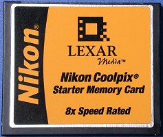 The camera comes with a Lexar 8X 16MB compact flash memory card (see the image below) that can hold about 31 1600×1200 images in JPG (compressed) format under the normal mode. Note that the actual number of images depends on the complexity of the recorded images.