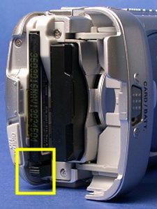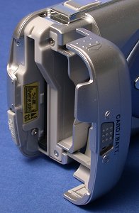 To retrieve the memory card, reverse the procedure. More precisely, (1) open the battery cover, (2) locate the card eject lever (below left), (3) push the card eject lever down to pop up the compact flash card (below right), and (4) remove the card and close the cover.