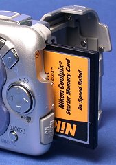 Note that the card slot accepts Type I CompactFlash cards. Do not try to insert memory cards of other types (e.g., SmartMedia cards).