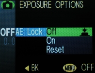 | Reset | Change the "locked" exposure parameters. More precisely, after selecting Reset, the camera is still in the AE lock mode; but, the exposure parameters used for the first photo taken after selecting Reset is used for all subsequent photos. Hence, when you have to change exposure parameters in the middle of a sequence of AE lock shots, use Reset. |