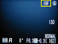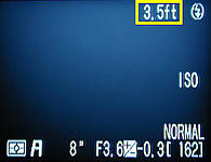 When the subject distance is 30ft or, equivalently, 10m, the next larger distance becomes INF. More precisely, if the subject distance is larger than 30ft or 10m, use infinity. The following shows the LCD monitor and control panel when the subject distance is infinity.