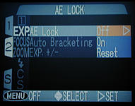 | Reset | Change the "locked" exposure parameters. More precisely, after selecting Reset, the camera is still in the AE lock mode; but, the exposure parameters used for the first photo taken after selecting Reset is used for all subsequent photos. Hence, when you have to change exposure parameters in the middle of a sequence of AE lock shots, use Reset. |