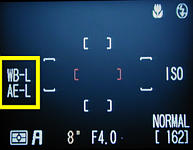 When AE Lock is in effect, the LCD monitor displays WB-L (white balance locked) and AE-L (auto exposure locked) on the LCD monitor.
