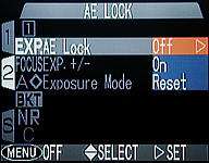 | Reset | Change the "locked" exposure parameters. More precisely, after selecting Reset, the camera is still in the AE lock mode; but, the exposure parameters used for the first photo taken after selecting Reset is used for all subsequent photos. Hence, when you have to change exposure parameters in the middle of a sequence of AE lock shots, use Reset. |