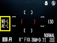 When AE Lock is in effect, the LCD monitor displays WB-L (white balance locked) and AE-L (auto exposure locked) on the LCD monitor.