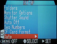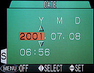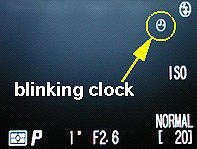 To keep track the date and time an image is captured, 995 has a built in clock and timer. This clock and timer is run by a rechargeable battery in the camera which is different from the battery for running the camera operations. This "hidden" rechargeable battery is charged when the camera has a battery in the battery chamber. However, this "hidden" rechargeable battery has no power when (1) you receive the camera and (2) you store the camera for a long period of time without a battery in the battery chamber (and hence the "hidden" rechargeable battery consumes all of its power). Should one of these two conditions happen, the camera does not have correct date and time. In this case, a blinking clock icon will be shown in the upper-right corner of the LCD monitor when the camera is in the A mode or the M mode. See the image below. So, when you see a blinking clock, it is the time to setup a correct date and time!