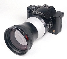 With step-up and step-down rings, one can mount many converter lenses. The left image below shows an Olympus WCON-07 0.7X wide angle on a Yoshida 55mm adapter tube. Since the WCON-07 has a 55mm thread, no step ring is needed. The second image below shows a Canon TL-55 1.4X teleconverter on a Yoshida 55mm adapter tube. Again, since the TL-55 has a 55mm thread, no step ring is required. The right image below shows an Olympus TCON-14B 1.45X telephoto converter on a Yoshida 55mm adapter tube. Since the TCON-14B has a 62mm thread, a 55-62mm step-up ring is needed.