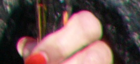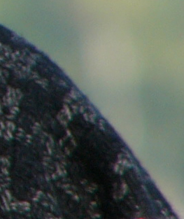 How about chromatic aberration? Yes, there are some. The following images show two types. The left one has a greenish fringe around the lady's fingers, and the right one shows a purple fringe along the edge of the lady's shoulder and the background. This is also an impressive achievement because virtually all teleconverter lenses that I have and used all are worse to much worse in the chromatic aberration department.