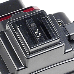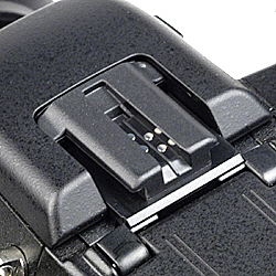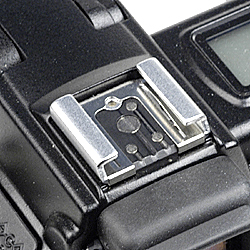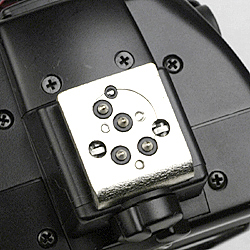 After the guide number, the next thing you need to know is the hotshoe and flash contacts. The standard hotshoe is the ISO one. The FZ-10 has a ISO hotshoe (left below). The ISO hotshoe is very simple. It has only one central contact and remaining is for ground contact. However, as long as a manufacturer follows this center contact, they can add any extra contacts for additional features. The middle image below shows a Nikon hotshoe. In addition to the center and ground contacts, there are three more contacts as shown by the three small circular dots. The only exception is Minolta's hotshoe that deviates from the ISO standard (below right). While it is very different from the ISO version, Minolta does sell an adapter that can be used to convert the Minolta hotshoe to the ISO version.