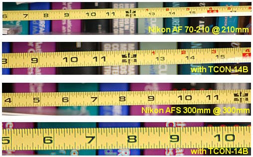 Many people measured the "power" or "magnification" of a teleconverter as follows. They take the image of a subject without a teleconverter, and, take another with a teleconverter mounted. Then, measure the length (or number of pixels) of the subject in each image, and calculate the "power" of the teleconverter as the quotient of dividing the image length without a teleconverter by the image length with a teleconverter. Here is an example. The following images were taken with a FZ-10 without a teleconverter (top) and with a Olympus TCON-14B 1.45X (bottom). The one without a teleconverter (top) measures approximately 13.5 inches, and the one with a TCON-14B measures about 11 inches. The "power" is only 1.23X rather than 1.45X. Based on this measurement, some claimed that the Olympus TCON-14B is 1.23X teleconverter rather than the marked 1.45X.