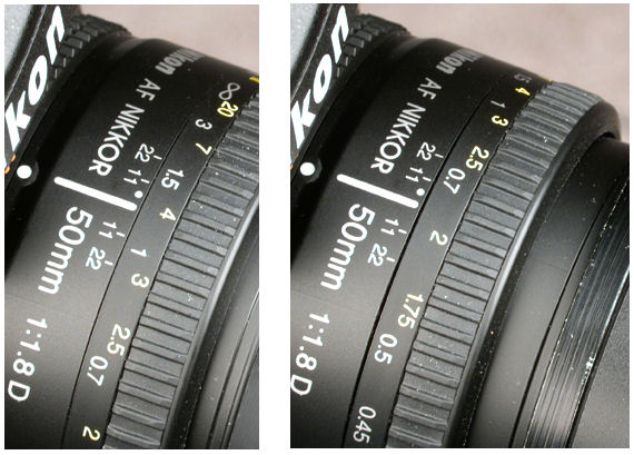 A Nikon AF SLR body, a Nikon 50mm f/1.8 normal lens, and a Olympus TCON-14B 1.45X are used in this experiment. First, the 50mm is mounted to a Nikon body and focus on a subject to read off the focus distance from the focus ring. As shown in the left image below, the focus distance is about 4 ft. Then, a TCON-14B is added to the 50mm lens, making the focal length of the combo 72.5mm. Without changing the position of the camera, let the combo focus on the same subject and read off the focus distance from the focus ring. This time we have about 2.1 ft (below right) rather than the original (i.e., without the TCON-14B) 4 ft! Something interesting here because there is no subject at focus distance of 2.1 ft.