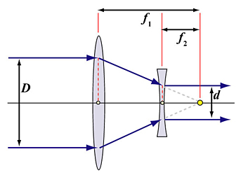 The diagram below shows the Galileo version, which is used for front-mounting converter design. This design consists of a positive lens of focal length f1 (left) and a negative lens of focal length f2. They share the same focal point as shown. We also assume light rays going from left to right, and the shared focal point is the right one of both lenses. In this way, the gap between these two lenses is f1 - f2. If an incoming light ray parallel to the lens axis hits the positive lens, it is bent toward the common focal point. Then, this bent light ray hits the negative lens. Since the incoming ray (of the negative lens) passes through a focal point (i.e., the common one), it will be parallel to the axis of the lens on exit.
