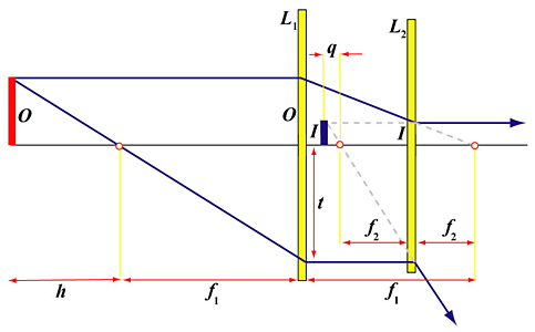 Let us introduce two more symbols q and t. The value of q is the distance between the left focal point of the negative lens L2 and the image position, and the value of t is the distance from the center of the positive lens L1 to the intersection point of the positive lens L1 and the light ray from the tip of the subject through the left focal point.