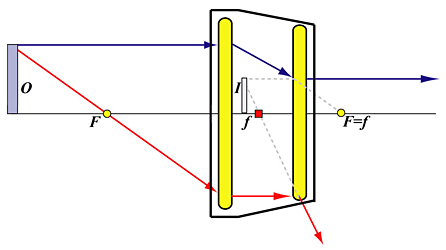 In general, light rays parallel to the lens axis converge to a focal point. However, in the above converter lens system, parallel entering light rays will exit in parallel. In other words, there is no focal point! Or, we may say the focal points are at infinity. A system without focal point is referred to as an afocal system. Hence, front mounting telephoto and wide angle converter lenses are afocal systems.