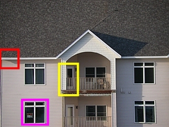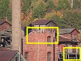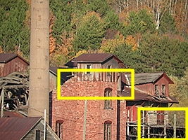 The first comparison is for distant scene. The following images were taken in a late afternoon with the scene a couple of hundred yards away. The yellow frames indicate the center and lower-right corner for comparison. Since the CrystalVue is a 8X monoscope that covers a much smaller area than the other two, the corner comparison may not be fair; however, one can certainly compare the EagleEye 5X and Kenko 6X without any problem. The shooting parameters are: aperture F8.2 (i.e., aperture-priority mode), matrix metering, shutter speed - which is determined by the meter - 1/153 sec (CrystalVue 8X), 1/102 sec (Kenko 6X) and 1/186 sec (EagleEye 5X), and Auto white balance). The shutter speed gives us a sense of light loss. The shutter speed when the EagleEye 5X was used, as mentioned above, was 1/186 sec, which is about 20% faster than that used by CrystalVue 8X (i.e., 1/153 sec). The CrystalVue is about 50% faster than the Kenko 6X, and, as a result, the EagleEye 5X is nearly one stop faster than the Kenko 6X.