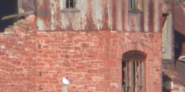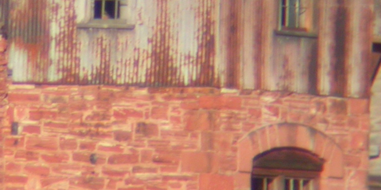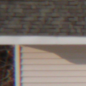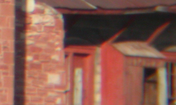 The following shows the 100% of the left side. The CrystalVue's crop is actually the upper-left corner, and, hence, the comparison is not entirely fair in this case. It is clear that the EagleEye is sharper and reveals more details of the roof than the Kenko 6X. On the other hand, its resolution power and more importantly contrast are lower than the other two lenses. Some purple/green fringing can be see near the left side of EagleEye's image; but, the situation is much better than the Kenko and CrystalVue. In fact, the latter always shows this type of fringing!