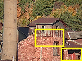 The following scene has a shorter subject-camera distance. It is about 200 yards away. We shall compare the three marked areas: center, left and lower left. Aperture used was F8.2.