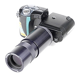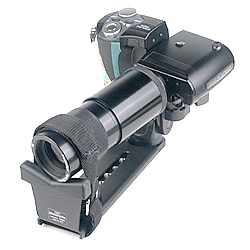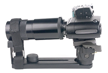 Of these monoscopes, the Kenko KUT632 and Nikon TelescoMicro ED6 × 18D come with tripod mounts in US models. CrystalVue 8X may have one but it is difficult to find, and the Kenko 6X does not need one because it is small. The EagleEye 5X does have a tripod mount; but, it is sold separately and is quite expensive. Without a tripod mount, using the EagleEye 5X on a 4500 mounted on a tripod is a scary thing. It is scary not because the lens may break the swivel body. It is because a dangling lens cannot help take sharp images. So, I try my Bogen 3420 telephoto lens support as shown below. Fortunately, it works fine although the setup looks odd. This telephoto support also works with CrystalVue. The only problem is that the lens and camera must be twisted to one side to make the lens rest on the support. Then, the support is mounted on a tripod. Yes, I still can focus.