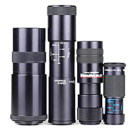 The front glass element of the EagleEye 5X is large. In the image below, from left to right, the lenses are EagleEye 5X, CrystalVue 8X, Nikon TelescoMicro ED6 × 18D and Kenko 6X. Note that a lower magnification requires a smaller front glass element. Judged by the size of the front glass element, the EagleEye 5X gathers more light and permits the use of larger aperture.