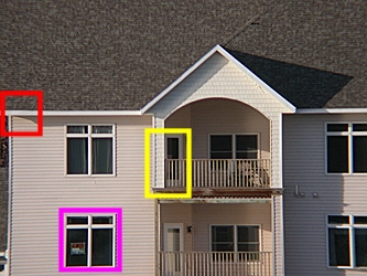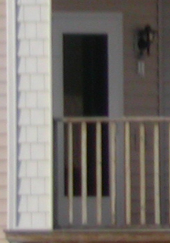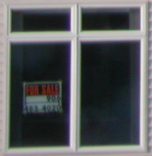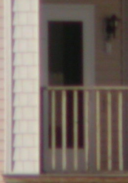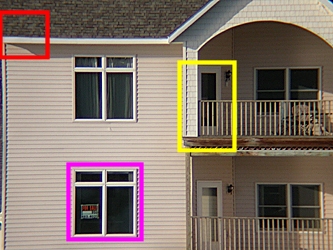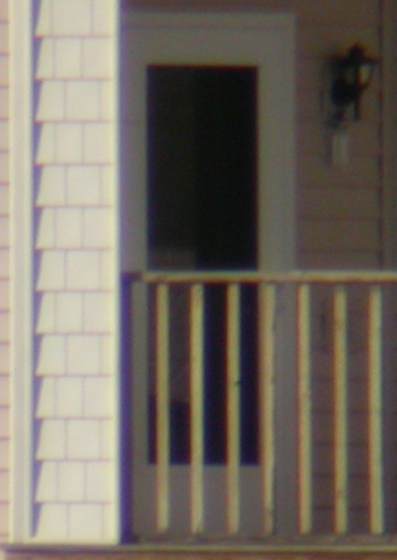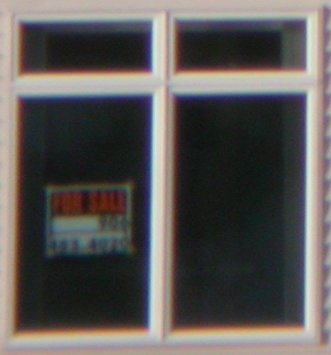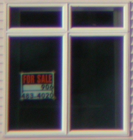 The following shows the 100% crop of the window in the lower left corner. The Kenko 6X result is soft. The EagleEye 5X and CrystalVue 8X show clear and higher contrast results. However, the EagleEye 5X image seems not as good as that of the CrystalVue 8X because it has lower sharpness and lower contrast. If you reduce the CrystalVue 8X result to the same size, you will see the telephone number very clearly shown, which is much better than that of the EagleEye 5X. Of course, the CrystalVue 8X result is still good without resizing. Note that due to higher contrast, the words "FOR SALE" can be seen in the image of CrystalVue 8X. However, chromatic aberration in the 8X images is bad and very visible.