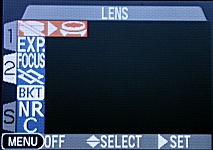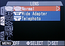 Coolpix 5700 has a short-cut for selecting a converter lens. Once the LENS item is highlighted, you can use the command dial to make a selection. As the command dial is being turned, the icon of a converter lens is shown on the first column. Keep turning the command dial until the corresponding converter icon appears. Then, press the MENU button to return to the shooting mode.