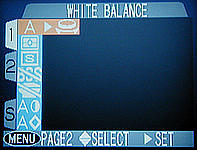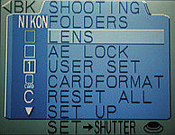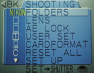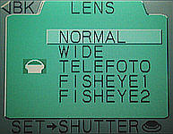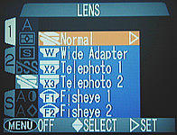 Coolpix 990 has a shortcut for selecting a lens converter. Once the LENS item is highlighted, you can use the command dial to make a selection. As the command dial is being turned, the icon of a lens converter is shown on the first column. Keep turning until the corresponding converter icon appears. Then, press the MENU button twice to return to shooting mode.