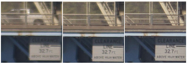 下面是橋左側下方的標示的200×200裁切, 自左而右是最大光圈f/6.3、f/11和f/22。除了最大光圈之外,其它兩者相差不大,不過都比中央部位稍弱,似乎離開非中心區域後品質下降頗快。