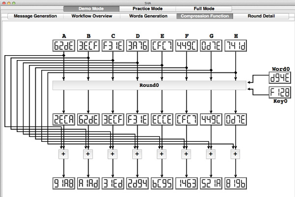 SHAvisual is designed to help students learn and instructors teach an advanced SHA algorithm, SHA-512. It has Windows, MacOS and Linux versions.
